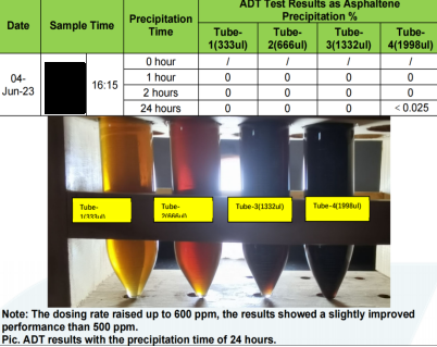 2023年5月底,德仕的瀝青分散劑LQY-03在伊拉克某區(qū)塊中試成功,在低加藥量下,原油中析出的瀝青質(zhì)得以有效的懸浮于采出液中,集輸壓力有效下降。該藥劑的表現(xiàn)得到甲方的認(rèn)可。